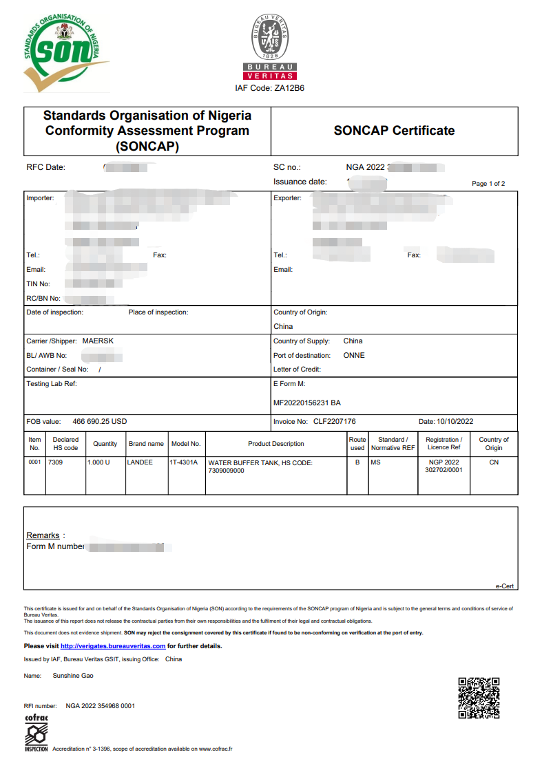 尼日利亚SONCAP认证的方法--申请SC有如下三种方式: Route A,针对一年偶尔出货的情况:出口商货物生产好以后,由检验员对货物进行检验,然后从大货中抽取样品测试,测试合格后,出具PC1证书,出货前进行监装并贴封条,合格后出具SC证书。 Route B,针对产品一年中多次出货情况:首先由出口商申请PC2,申请PC2的流程如下:申请表;产品信息;有效的测试报告;工厂进行体系审核;PC2拿到后有效期为一年。工厂在货物生产好以后,申请SC监装,资料齐全以后对货物按不低于40%比率检验、抽样测试及监装,合格出具SC证书。 Route C,针对一年频繁出货的情况。首先由工厂申请PC3,申请条件如下:工厂进行审核且合格;有效的测试报告;拿到License后的有效期为一年。 工厂在货物生产好以后,申请SC流程如下:资料齐全以后对货物进行一定比率的检验和监装,一年不少于两次。 尼日利亚SONCAP认证的费用 1、证书费:包括有PC1一次性费用,PC2一年期费用,PC3一年期费用,每批次SC证书费; 2、审核费:工厂审核费及监装、抽样费; 3、测试报告费用:如果您不能提供符合要求的测试报告,我们将为您提供测试报告服务,价格根据产品种类不同而不同。 |
